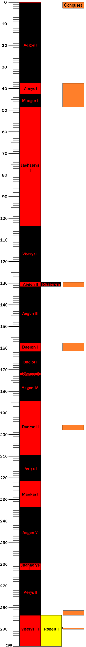 Hronoloģiskais rādītājs ar karaļu un karalieņu pēctečiem pēc Aegona Izcelšanās. Tārgārjenu karaļi ir iezīmēti melnā un sarkanā krāsā, Barateons - dzeltenā un nemieru periodi - oranžā.