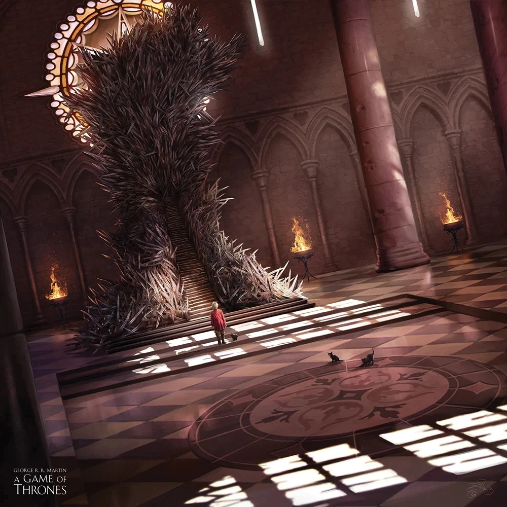 I. Tommen Baratheon ve üç kedisi, Demir Taht önünde, Magali Villeneuve © Fantasy Flight Games
