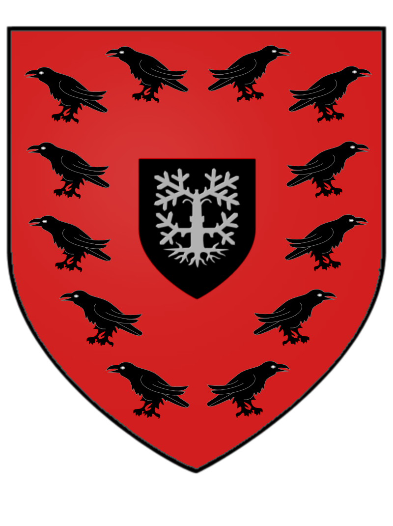 布莱伍德家族的纹章 : 鲜红底色上的鸦群围绕着一面绘有死去的鱼梁木的黑色小盾章. |