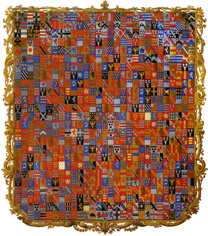 四分纹从右上最接近持盾人右肩的一角(此段描述皆是从持盾人角度看)开始排序,右上首席为第一纹,左上为第二纹,右下为第三纹,左下为第四纹。当四分的融合纹章包括三种纹章时,一、四纹要相同;只包括两种纹章时,则二、三纹也要相同。个人纹章要沿袭其祖先或被继承人传承的纹章,正常情况下按照和谱系排列相同的顺序,最左要追溯到父亲的父亲的父亲的父亲……的父亲(世代越多越好),最右追溯到母亲的母亲的母亲的母亲……的母亲。有少数家系积累了上百个纹章,尽管如此之多的纹章只能在记录家族背景的文书里里出现了。[9]